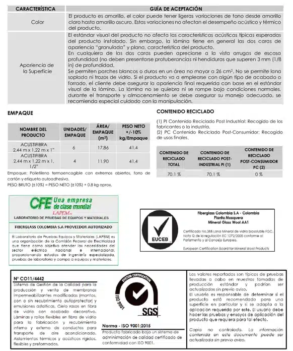 Láminas en lana mineral de vidrio de alta densidad que permiten la absorción y control del ruido en espacios interiores como auditorios, teatros, estudios de grabación, salas de música, oficinas, entre otros.