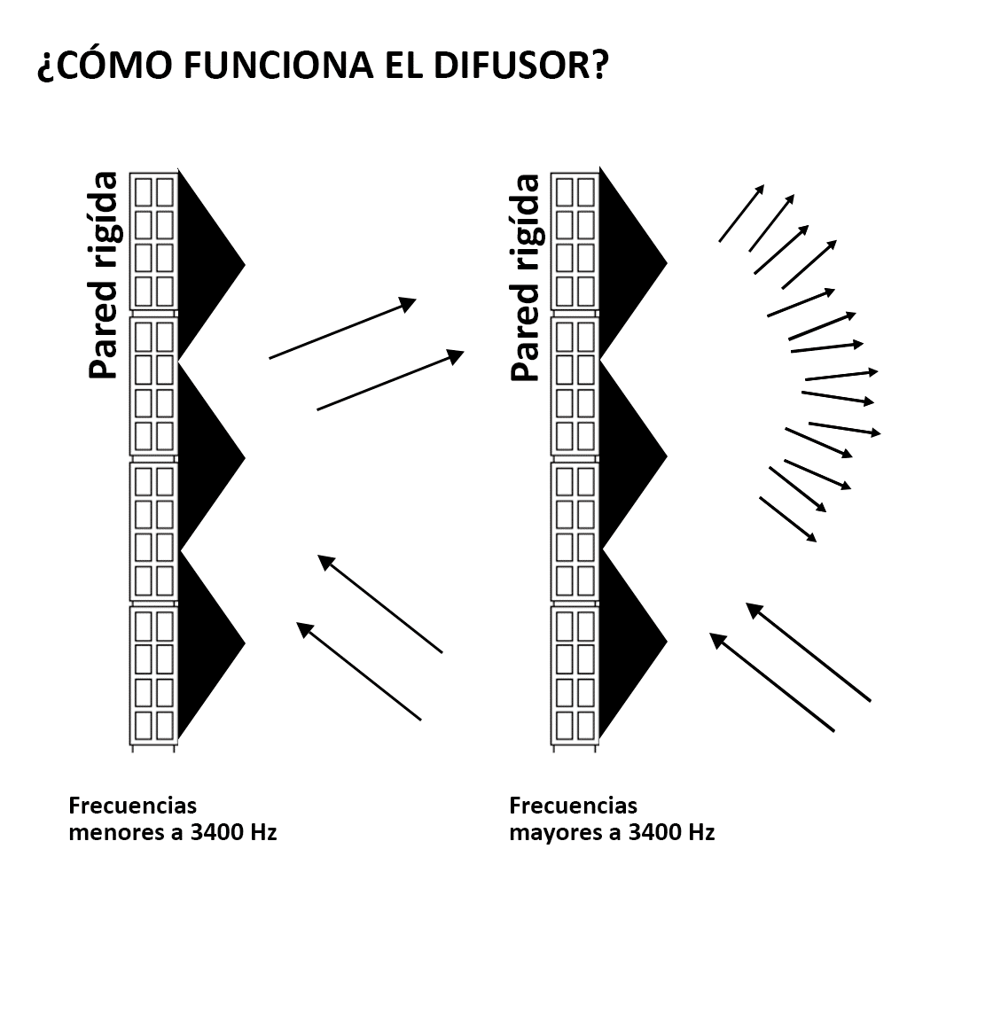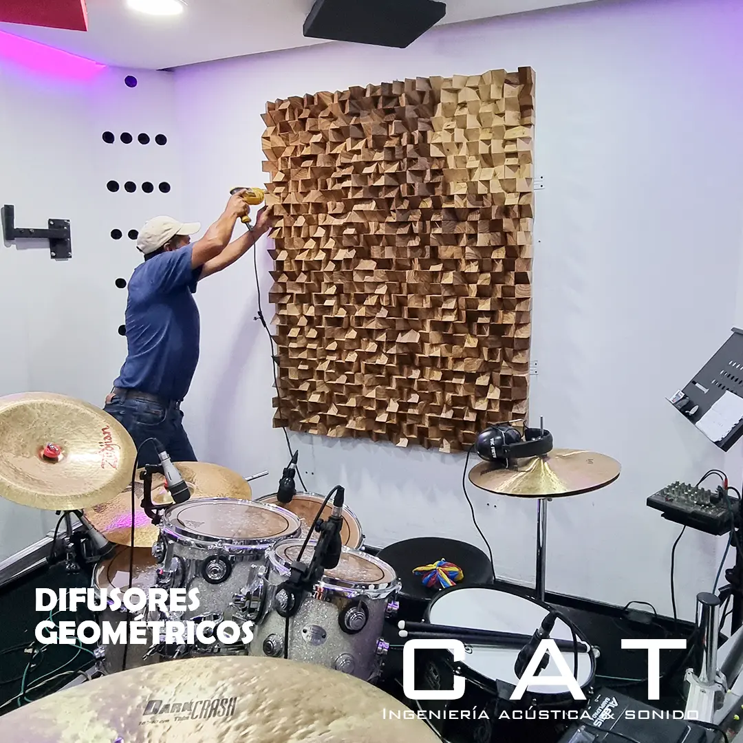 Difusor geométrico: rompe en frente de onda de acuerdo a un frecuencia de diseño, dicha frecuencia se es de 3400Hz, ideal para generar que el sonido se escuche más estable en diferentes punto de la sala y sea más homogéneo en frecuencias altas.