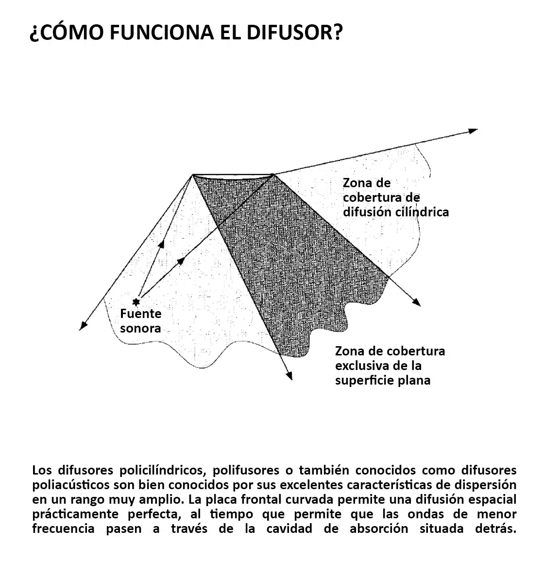 Difusor cilíndrico: los difusores policilíndricos son un conjunto de superficies convexa con textura lisa o semi lisa dispuestas secuencialmente y con un radio de curvatura menor a 5 m. Al usar un radio menor a 5 m, la zona de curvatura aumenta de tal manera que el sonido reflejado se dirige en varias direcciones.