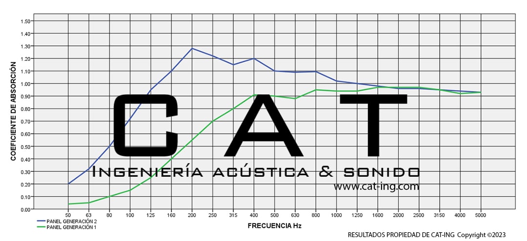 Tenemos 2 variantes de paneles, y claro varia en efectividad, el primero GENERACIÓN 1 y GENERACIÓN 2. ¿Cuál debes usar? Depende mucho de tiempo de reverberación que tu sala tenga previo a la instalación de nuestros paneles CAT-ING. A continuación, se muestra la eficiencia de nuestros paneles.