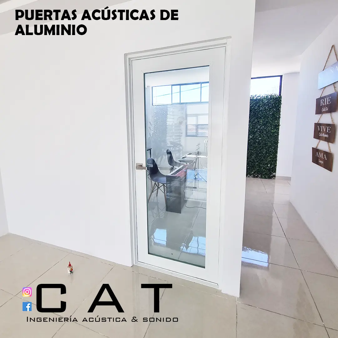 Puerta acústica con vidrio doble y marco perimetral de aluminio, sellada herméticamente; así que mejora el confort acústico de tu oficina manteniendo la elegancia de un sistema de aluminio o PVC.
